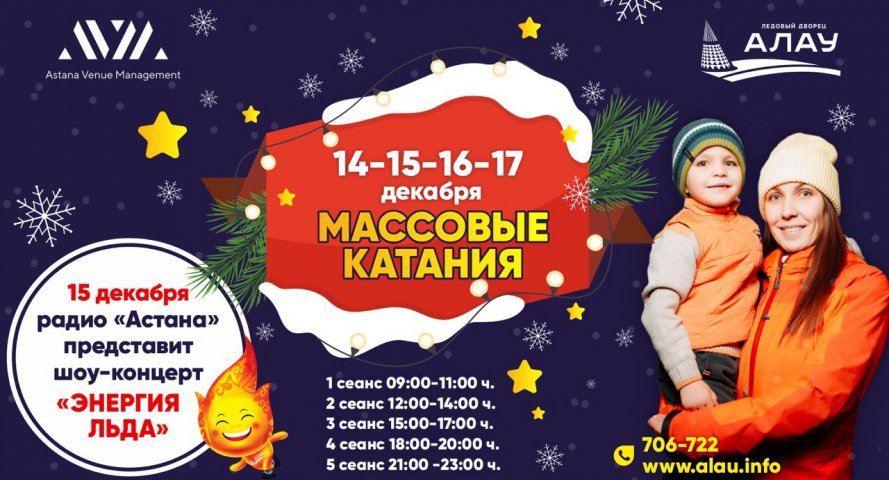 15 желтоқсан 15.00 де сіздерді «Алау» мұз айдыны сарайында күтеміз. Билеттер Астана радиосының эфирінде ойнатылады.